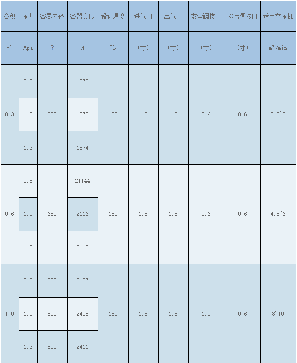 選配儲氣罐壓力應與空壓機的工作壓力一致,容積大小約為空壓機容積流量的1/5-1/10;環(huán)境條件允許的話可選擇大容積的儲氣罐,有助于儲存更多壓縮空氣和更好地預除水。