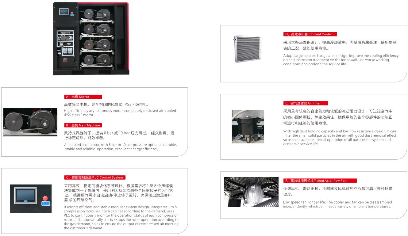 1.無油渦旋式壓縮機,無需要使用油和水及對應的后處理,不僅環保,成本也低。